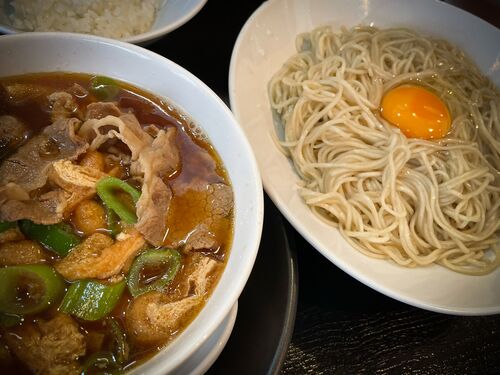 麺創なな家 牛キツネ南蛮つけそば 1580円 ごはん付 丼のご飯も付いてボリューミーな豪華さ。 このビジュアルなんだかワクワクする。つけ汁の中には具材が詰まっていて掘っても掘っても出てくる。具材をご飯の上に乗せて食べることを推奨しているので小さな茶…