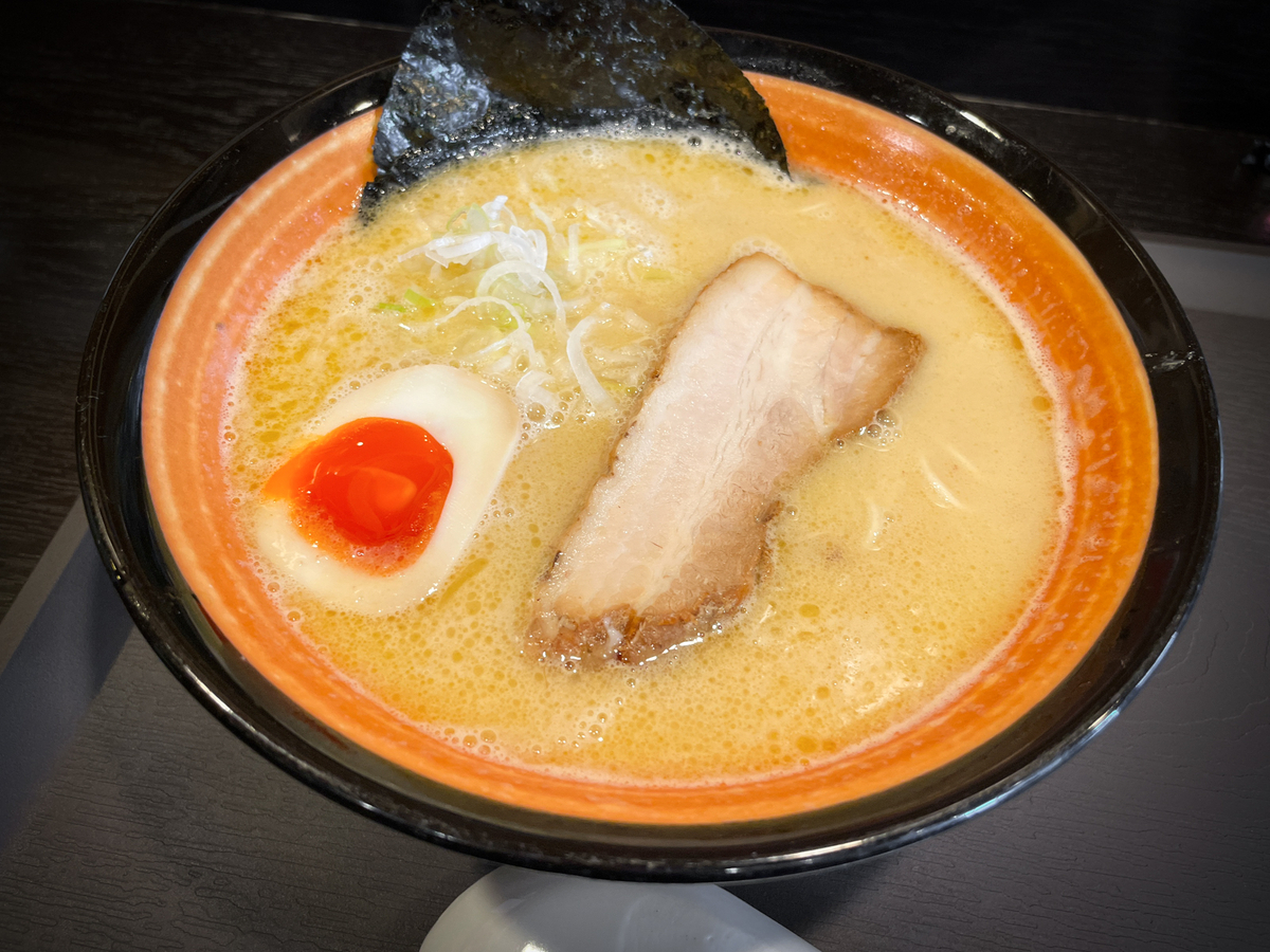 濃厚白湯麺塩はざらつきを持つ白湯、麺はぱつっとした細麺。濃厚なので替玉で少しくらいスープが薄まっても平気。替玉1回だけだが全然変化がなかった。
