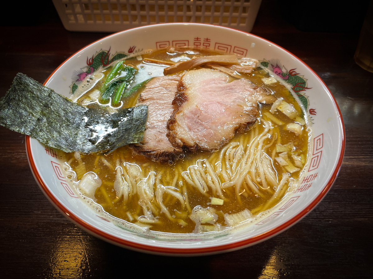 思っていたよりもオイリーでスープを飲むと魚臭さを感じるくらいの煮干し感、麺を食べていると感じないけどスープを飲むと魚の強い主張を感じる。麺はつるつるストレート滑りが良くてどんどん啜ってしまう。